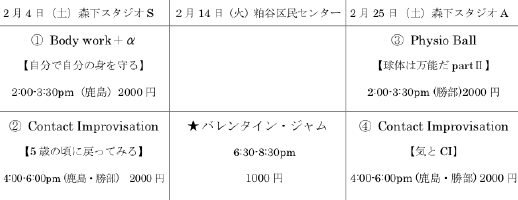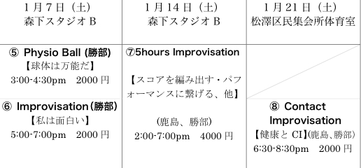 そして新しい年には、フィジオボールがお出迎え。いわゆるバランスボールです。ボールの数に限りがありますので、定員7名様ご予約下さい。もしくはご持参下さい。様々なエクササイズや遊びを通して、身体と心、神経と筋肉、人と私、、、繋げて行きましょう。7日のインプロビゼーションクラスは、自分が自分を大好きになり、おもろいやっちゃ!と楽しむ事が狙いです。14日には、たっぷりお時間ください。普段とは違う時間の使い方が、新しい発見を生み出すかもしれません。21日は、これから益々役に立つダンスの活用法も含めて練習しましょう。
